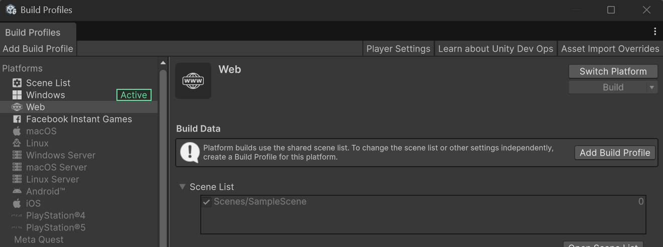 Once the project loads, open the Build Profiles settings under File -> Build Profiles. Select Web from the platforms on the left and click the "Switch Platform" button at the top right. It will take a few minutes to update and recompile scripts.